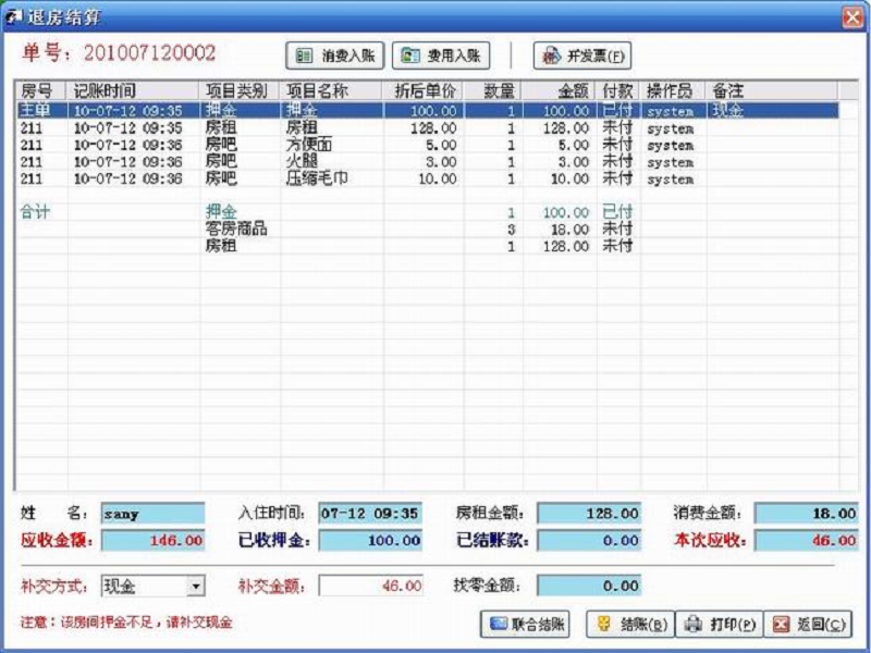 3、能对客房消费对行相关处理。